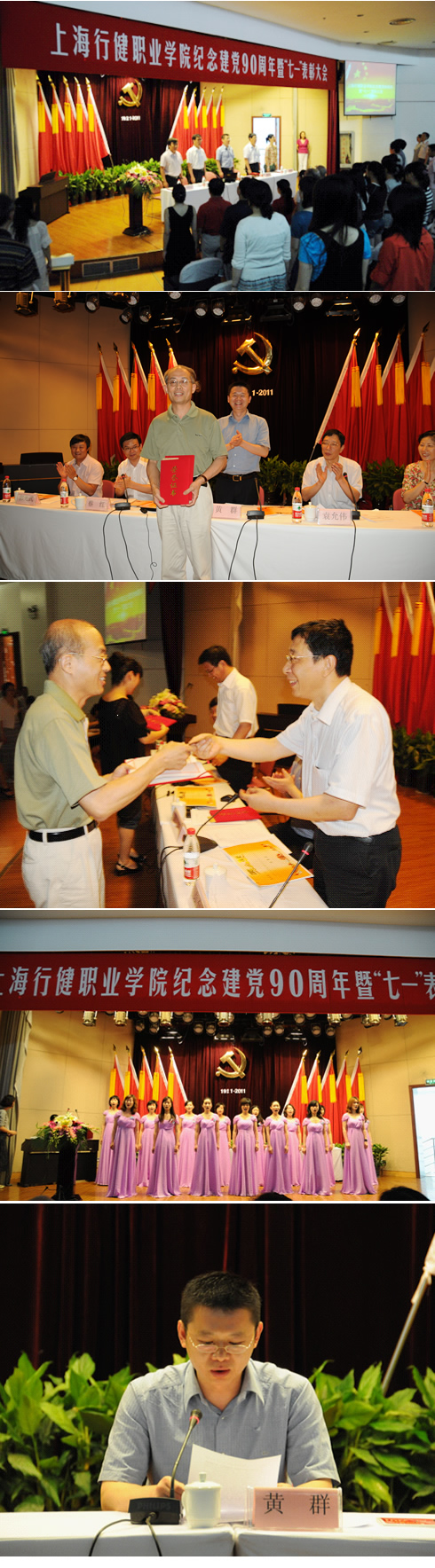 为庆祝中国共产党90周年华诞,树立典型,表彰先进,号召学院全体党员向一批先进组织与个人学习,展示学院学习实践、创新发展的成果,7月1日,学院在1109大礼堂隆重举行建党90周年表彰大会,全体党员出席。大会由七项内容组成:一、表彰2010年度先进党员个人和党的基层组织;二、学院党建网开通;三、表彰建党90周年系列活动(诵读、征文)中获奖的集体及个人;四、观看优秀共产党员章卫芳同志先进事迹专题片——《十年,携爱同行》;五、微型党课演讲;六、教工合唱团红歌展演;七、党委书记黄群做重要讲话。会议由院长、党委副书记袁允伟主持。