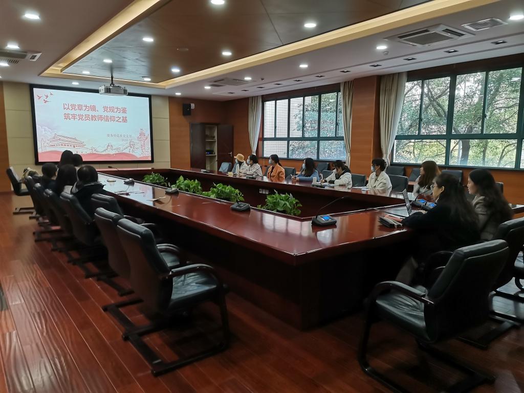 商务外语系党支部于12月9日在2214召开“以党章为镜、党规为鉴 筑牢党员教师信仰之基”四史专题学习会,会议由系支部书记杨晓霞主持,全体党员参加。