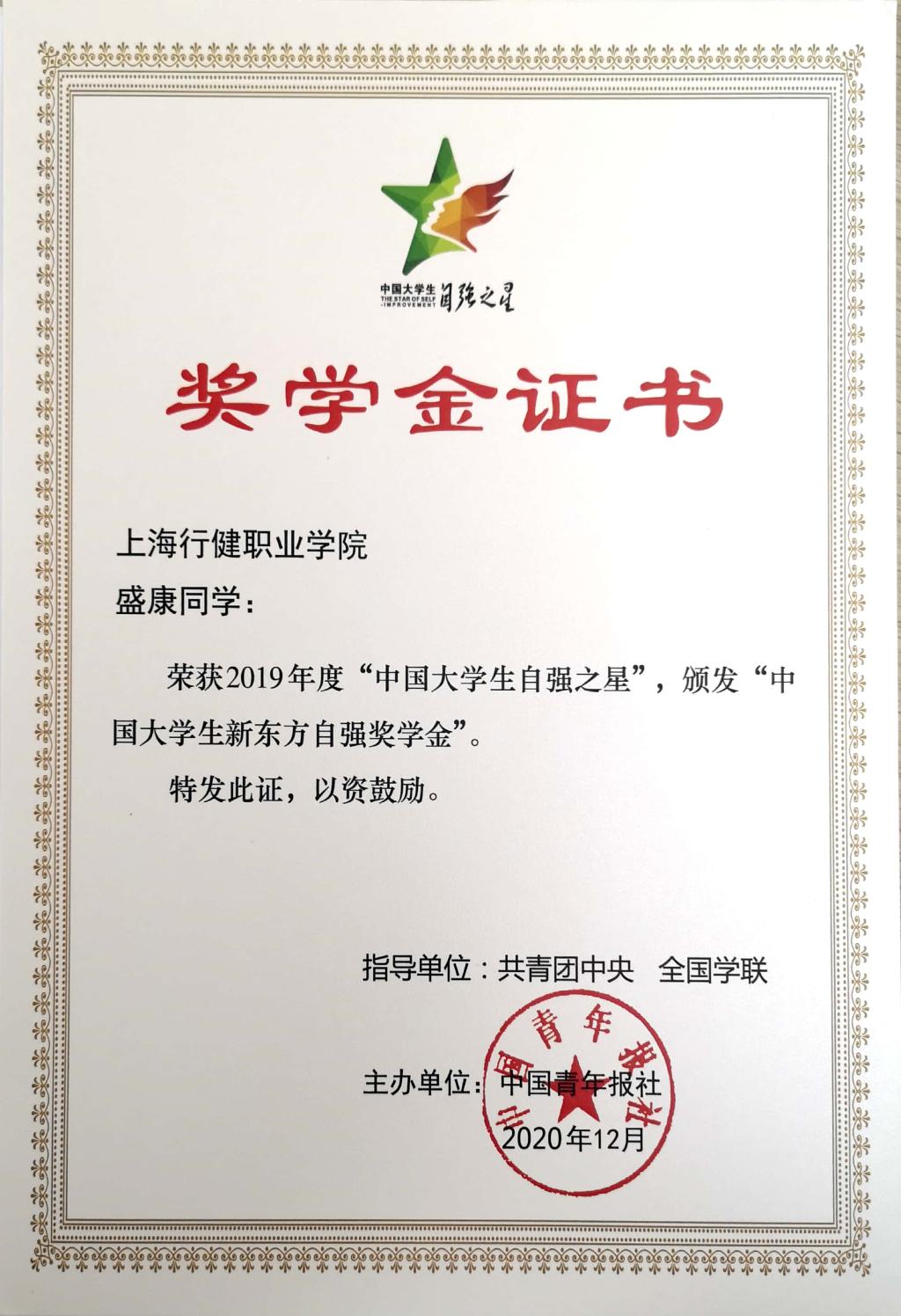近日,由共青团中央、全国学联指导,中国青年报社、新东方教育科技集团联合开展的2019年度“中国大学生自强之星”奖学金名单发布,我院信机系2018级软件技术2班盛康同学荣获“中国大学生自强之星”奖学金。