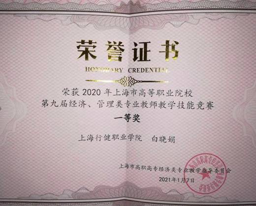为认真贯彻国务院关于《国家职业教育改革实施方案》(职教20条)的通知要求,落实习近平主席在建党95周年提出的“中国特色社会主义道路自信、理论自信、制度自信、文化自信,”以及在全国高校大学生思政工作会议的重要讲话精神,经管系白晓娟老师报名参加了2020年上海市高等职业院校第九届经济管理类专业教师教学技能大赛,白老师在“说好一门课”的基础上,有机地融入社会主义核心价值观和中国特色社会主义道路“四个自信”的思政内容,使说课教学内容与思政内容、专业理论、专业实践相结合。比赛中,经初赛和复赛的激烈角逐,白晓娟老师荣获2020年上海市高等职业院校第九届经济、管理类专业教师教学技能竞赛一等奖。