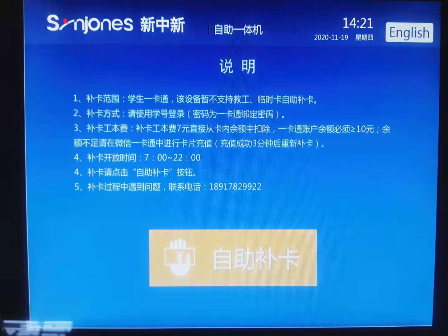 此次自助补卡机的投入使用,进一步方便了学生日常补卡。自助补卡机每天工作时间为7:00—22:00,保证了学生一卡通丢失或损坏时能够及时补办。该服务投入使用以来,受到广大学生的欢迎。目前自助补卡机设备运行稳定,设备从启用至今有补卡人次近千次。