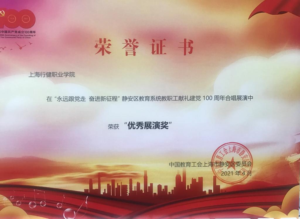 为迎接建党100周年,学院工会组建了以学前教育系教职工为班底的合唱队,参加由静安区教育工会组织开展的“永远跟党走,奋进新征程”——静安区教育系统教职献礼建党100周年合唱比赛展演活动。我院合唱队在136支参演队伍中脱颖而出,最终荣获“优秀展演奖”。