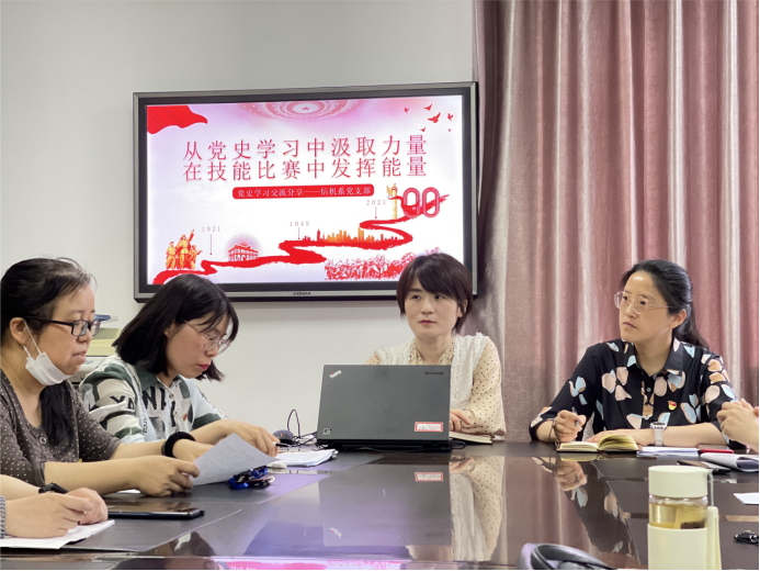 在庆祝建党100周年之际,为推动党史学习教育持续走向深入,5月28日中午,信机系党支部开展以“从党史学习中汲取力量 在技能比赛中发挥能量”为主题的党日活动。学院党委书记沈燕华莅临支部参加此次主题党日活动。在此次党史学习相关的经验交流活动中,支部党员教师结合在党史学习中的心得感悟,畅谈本学期技能比赛参赛带赛过程中攻坚克难的经历,其中汽车专业施一敏、软件专业东苗、机电专业姚靖靖作为党员教师代表先后进行了经验分享,指出要在平时的教学和实训中严格管理、精益求精,打牢专业基础。此外,在比赛中,大局意识、凝心聚力的团队精神至关重要。与会党员教师纷纷表示深受启发、受益匪浅。