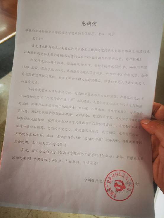 泸西县三塘乡阿定村委会为表达对我院经管系全体师生的感谢,于6月9日寄来感谢信,信中表示:对于阿定村的留守儿童来说,是你们的爱心让孩子们感受到社会的温暖, 把曙光和希望带到了他们身旁,所以你们捐赠的不仅仅是书籍,是对知识、对文化的肯定,是对留守儿童的殷切期望和无限鼓励。