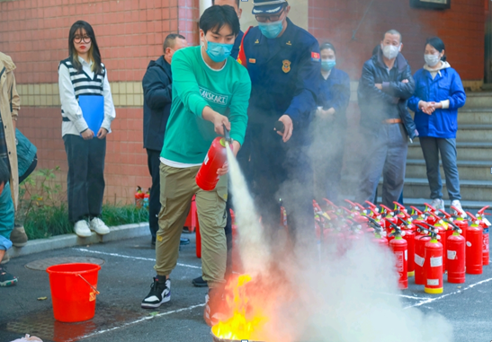 一声急促的防火警报响起,二楼的阳台冒起了滚滚浓烟。随后,居住在校内宿舍的同学们紧捂口鼻,伏低身体,一个个排着队井然有序地撤离了住宿楼。与此同时,消防队员们驾驶着消防车驶入校园,训练有素地拿出灭火器、防火毯等装备为同学们演示了灭火过程。