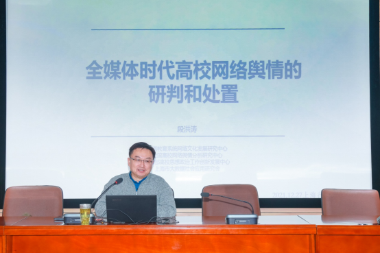 12月27日,学院党委中心组在敏行楼2213举行网络宣传与舆情管理专题辅导报告会。全国高校网络舆情分析研究中心执行负责人、教育部高校思想政治工作创新发展中心(网络舆情方向)执行负责人、上海教育系统网络文化发展研究中心副主任、副研究员段洪涛应邀作“全媒体时代高校网络舆情的研判处置及引导”报告。党委书记沈燕华主持报告会。校级、中层干部出席。