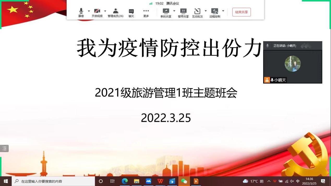 为全面贯彻落实学校关于疫情防控工作的部署需求,做好疫情防控期间大学生的心理健康教育,增强大学生时代责任感,经济管理系根据学院疫情防控工作安排,组织辅导员以腾讯会议作为平台,开展了“准封闭期校园防疫——我为疫情防控出份力”主题班会,积极宣传学校应对疫情以来所做的工作和发布的通知公告,强调了学校在疫情防控期间的纪律要求,鼓励大家从自己做起,为疫情防控贡献一份力量。