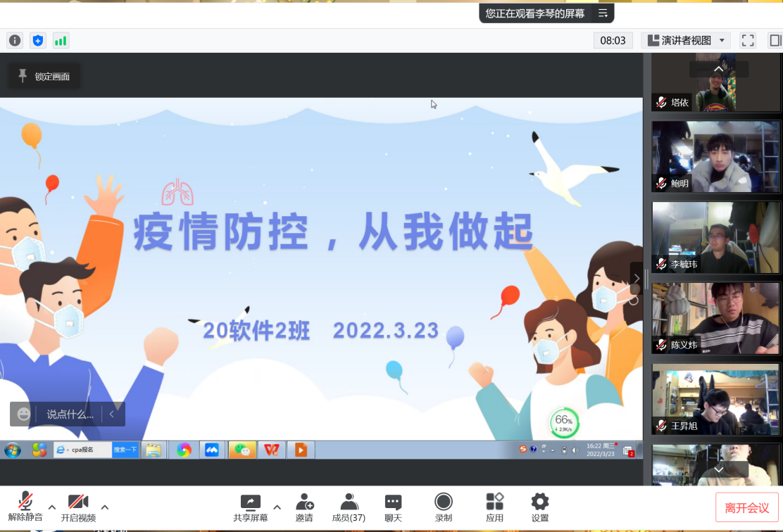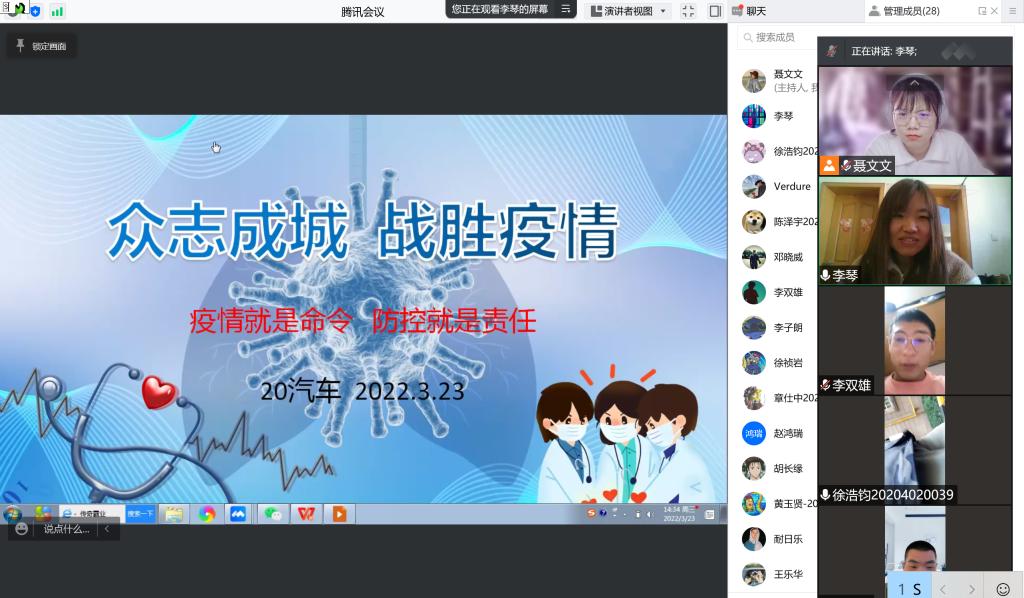 疫情当前,青年先行;共克时艰,人人有责。此次线上主题班会,使学生们进一步认识到了疫情防控形势的严峻性,拉近了特殊时期师生之间的距离,有效引导广大青年凝心聚力、共克时艰。(信机系)