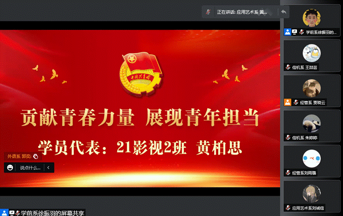 本期培训班开班仪式共分四项议程。仪式伊始,全体培训班学员自觉云起立共唱国歌。应用艺术系21级影视多媒体技术2班黄柏思同学作为学员代表发言,她表示团员青年要以身作则,勇于担当时代责任,将小我融入祖国、人民的大我之中,让团旗在战“疫”中高高飘扬。