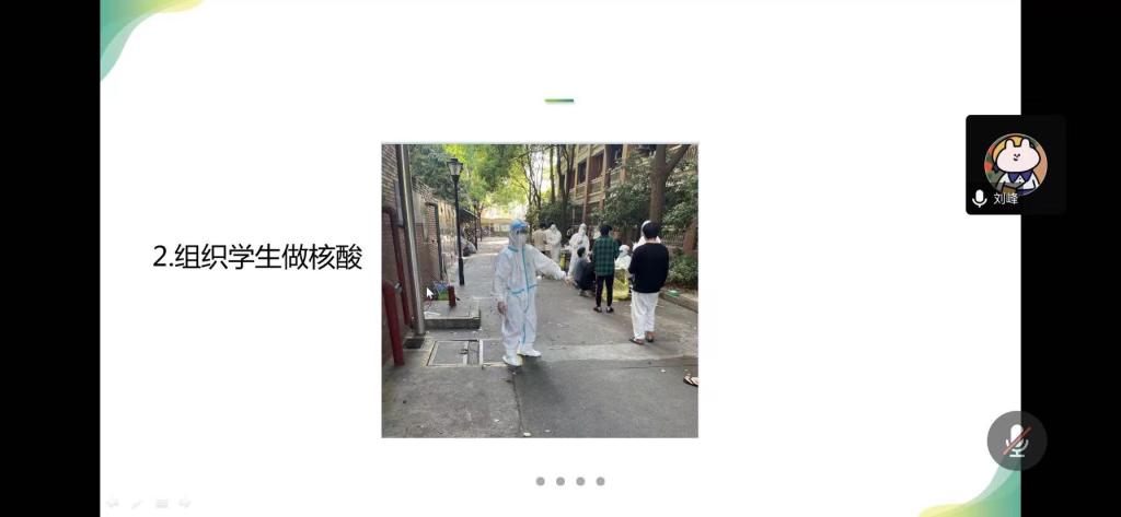 接着,刘峰老师说道,身为辅导员的他不但要时刻关注班级同学,及时帮助他们疏导心理状况,还要每天给同学们测量体温,组织学生有序开展核酸检测以及为大家发放物资等其他事项。他表示能帮助大家,尽一份自己的力,便觉得所有的付出都是值得的。他相信在大家的共同努力下,一定会取得疫情防控的最后胜利。