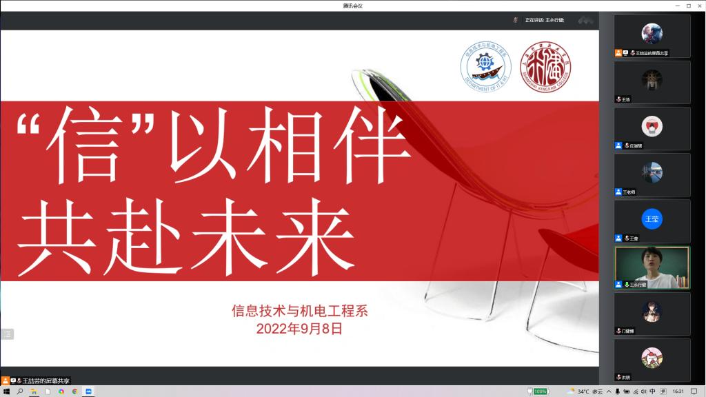 9月8日下午,信机系组织开展“‘信’以相伴 共赴未来”新生入学线上教育活动。信机系主任王莹、党支部书记王永以及信机系2022级四位新生辅导员和2022级全体新生参加宣讲会。此次宣讲会旨在使新生对大学生活有更好的认识和规划,进一步了解专业培养目标和未来的就业方向,帮助学生充分了解所学专业,激发学生的专业学习兴趣,增强学习自觉性。