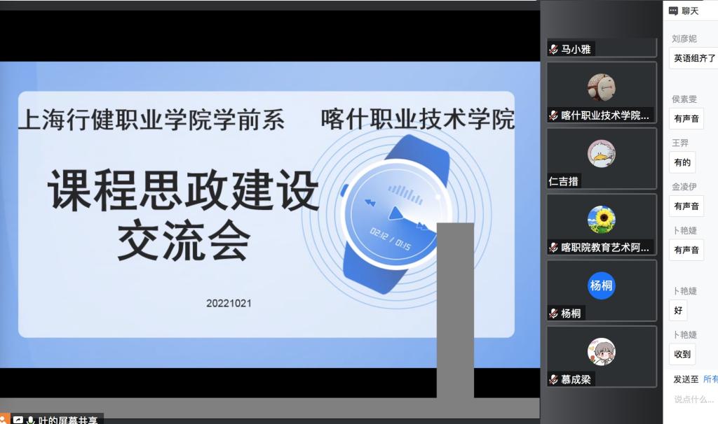 在学院的高度重视和学前教育系教师的大力支持下,学前教育系于2016年起与喀什职业技术学院学前教育专业开展对接帮扶工作,近几年来,学前教育系积极组织策划各项富有实效的对接帮扶活动。为加强交流,助力双方学前教育专业师资教学教研能力和课程思政建设能力的提升,近日,学前教育系举办了“课程思政建设交流会”,学前系主任李娜、学前系全体教师及喀什职业技术学院的教师们一同参加此次交流。