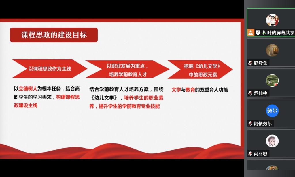 首先,学前教育系三位青年骨干教师进行了《学前儿童美术教育》、《幼儿园教育活动设计与实施》和《幼儿文学》三门专业课程的展示。三位教师分别从课程思政目标、课程思政内容和实施强调了立德树人的重要性,突出课堂育德、典型树德、规则立德,引导学生树立学为人师、行为世范的职业理想,培养学生爱国守法、规范从教的职业操守,把对国家的爱、对教育的爱、对学生的爱融为一体,自觉以德立身、以德施教,争做有理想信念、有道德情操、有扎实学识、有仁爱之心的“四有”好老师,坚定不移走中国特色社会主义教育发展道路。