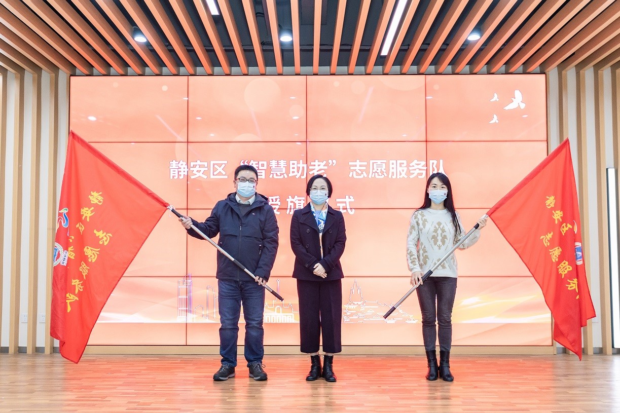 静安区委宣传部副部长、区文明办主任朱凤为学院“智慧助老”志愿服务队授旗。