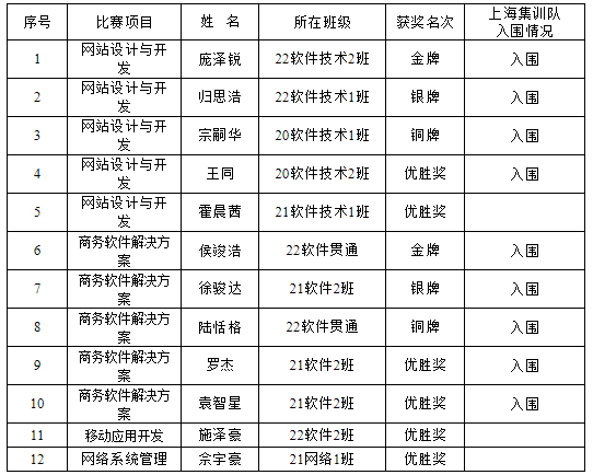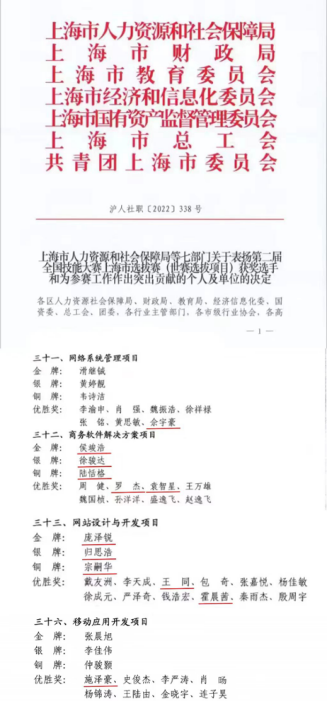 由上海市人力资源和社会保障局、上海市财政局、上海市教育委员会、上海市经济和信息化委员会、上海市国有资产监督管理委员会、上海市总工会、共青团上海市委员会等单位主办的第二届全国技能大赛上海市选拔赛落下帷幕。学院信机系共12名学生获得了4个项目的2金2银2铜6优胜的佳绩,其中共9名同学入围了商务软件解决方案和网站设计与开发两个世赛选拔项目上海市集训队;信机系教师黄雅菁、孙富菊荣获项目优秀指导教练荣誉称号。