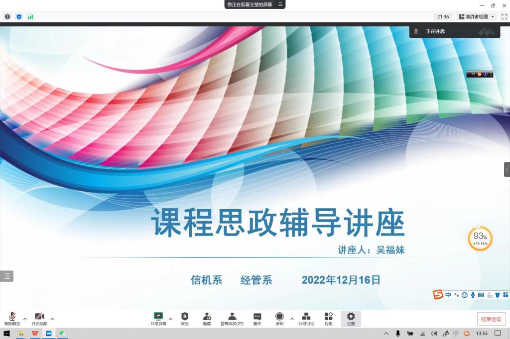 此次讲座主题鲜明,内容丰富,深入浅出,入脑入心,讲座结束后,信机系主任王莹、经管系副主任孙天慧分别代表学系感谢吴老师的分享,并指出宝贵的知识和经验分享为专任教师后续开展课程思政工作指明了方向和思路,也希望全体教师能够通过专题辅导,结合学科和课程的特点,从思政课程的核心思想出发,进一步挖掘和思考专业课程可以融入的思政元素和内容,落实“立德树人”,不断提高星空体育网址入口质量。(经管系、信机系)