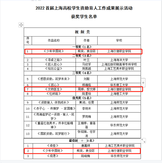 为落实立德树人根本任务,大力弘扬工匠精神,全方位、立体式展示全市高校资助育人工作成果,激励大学生勇担“厚植工匠精神,技能强国有我”的时代使命,上海市教育委员会主办的“助学励志 精工至善 传承创新 卓而越己”——2022首届上海高校学生资助育人工作成果展示活动评选结果揭晓。经各高校推荐、专家评审,学校应用艺术系熊奕等4名学生在本次活动视频展示类别中获奖,其中熊奕、袁俊窈制作的《少年中国说》在视频类别中获得一等奖和“最佳创意奖”、周婷、黎文婷制作的《文物医生》荣获三等奖。