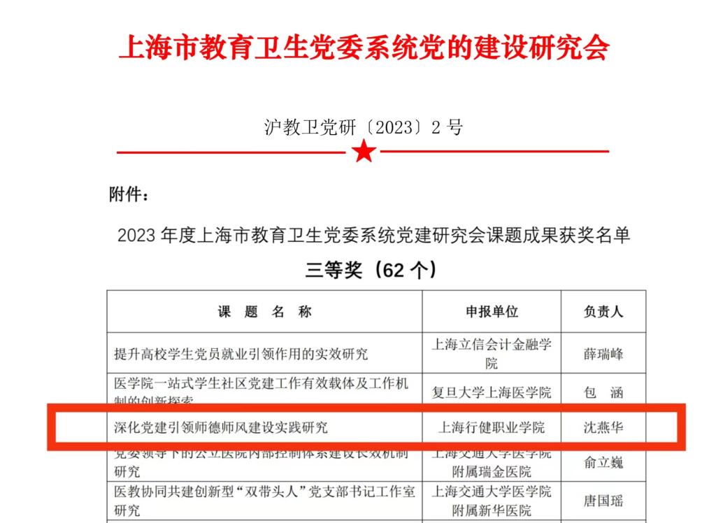 近日,上海市教育卫生党委系统党建研究会公布了2023年度党建优秀课题研究成果。经党建研究会各团体会员单位层层把关、择优选送,共提交课题成果296 项,经评审,最终推选出优秀成果93项,其中一等奖5个、二等奖26个、三等奖62个。我校党委书记沈燕华主持的课题《深化党建引领师德师风建设实践研究》荣获2023年度上海市教卫党委系统党建研究会课题成果三等奖,同时获上海党建研究高校专委会课题成果二等奖。
