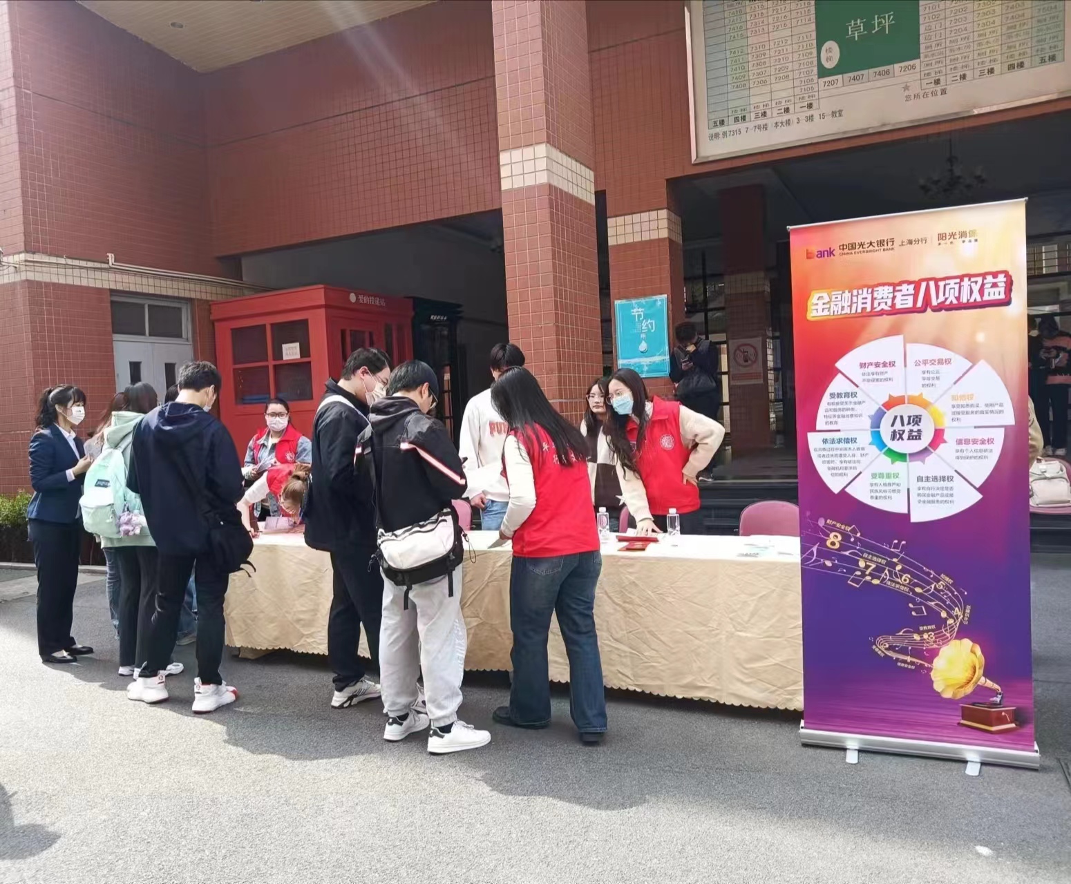 3月15日中午,后勤保卫处联合光大银行静安区永和新城支行在校园进行了主题为“共筑诚信消费环境,提振金融消费信心”的3▪15消费者权益日主题教育宣传活动,学校大学生平安志愿者行动支队成员全程参与。此次活动宣传的内容包括两部分,一是介绍今年3月1日起施行的《银行保险机构消费者权益保护管理办法》,二是倡导大学生理性消费,合理规划资金用途,远离校园网贷陷阱。