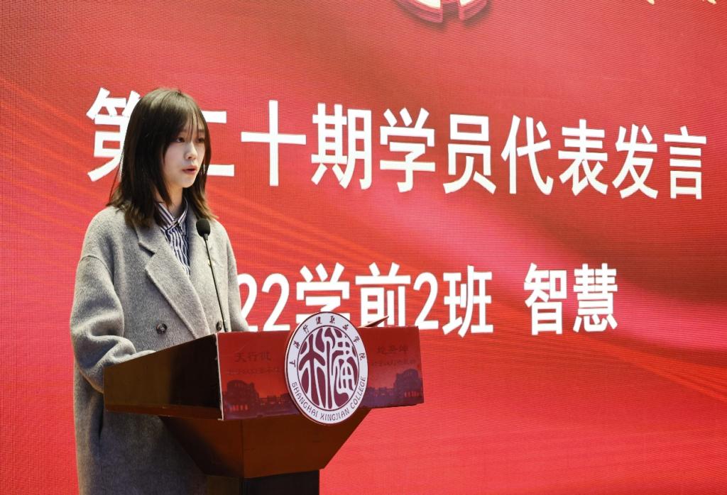 学前教育系2022级学前2班智慧同学作为学员代表发言,她以亲身经历号召同学们在学习与实践中勇敢肩负起时代赋予的重任,志存高远,以强国有我的使命担当奉献青春力量。最后,仪式在全体团员共唱团歌中落下帷幕。