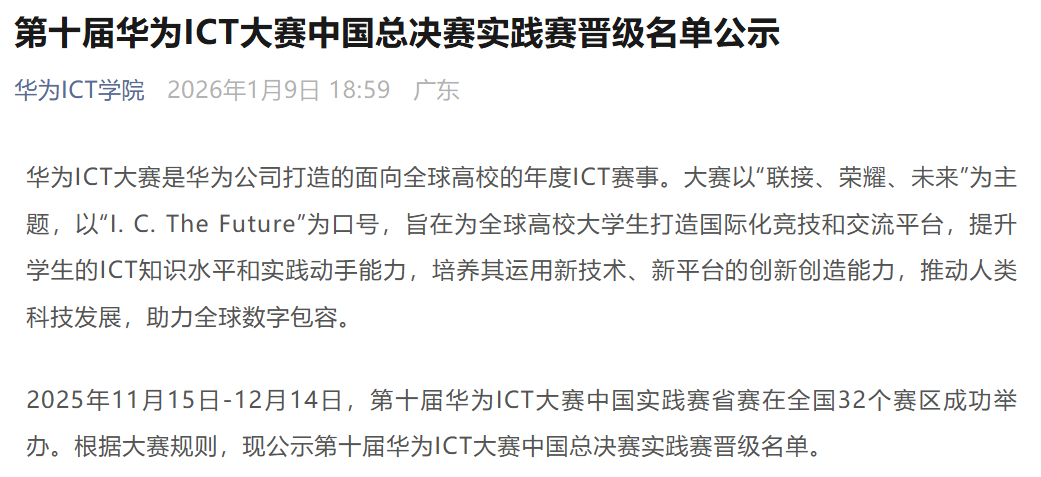 此次成功晋级全国总决赛,不仅是对参赛同学个人能力的极大肯定,也是我校持续推进教育教学改革、强化实践教学、注重创新型星空体育网址入口成果的生动体现,是我校华为现代产业学院又一亮眼成绩。信息学院长期以来致力于将行业前沿技术、企业真实项目与教学过程相融合,为学生提升综合竞争力奠定了坚实基础。