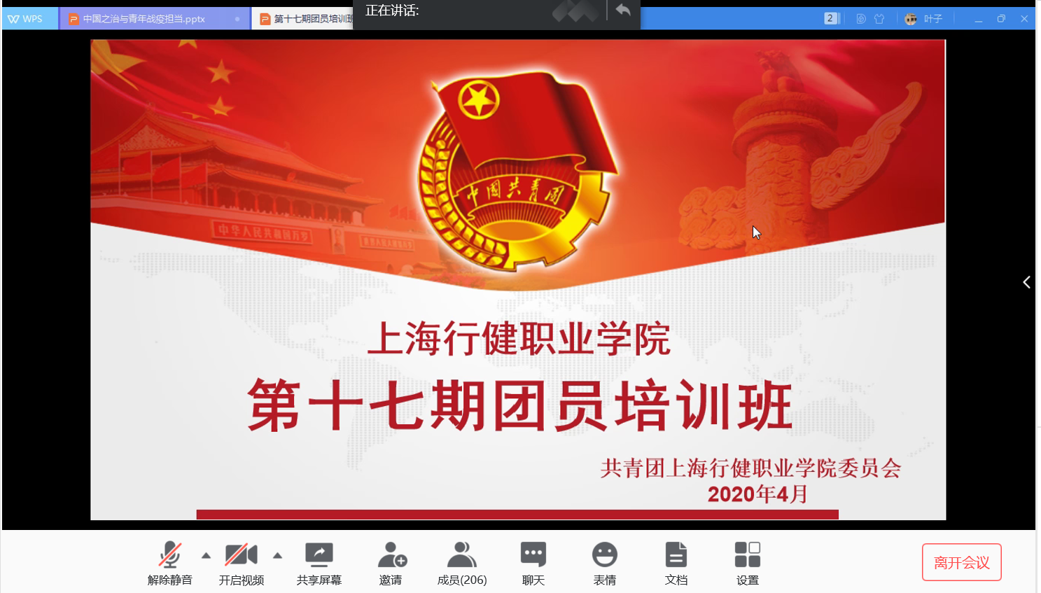 面对当前国内常态化疫情防控与经济社会秩序全面恢复的挑战及复杂的国内外形势,为了引导广大团员青年、团干部保持清醒理智头脑,理性看待各种舆论信息,学院团委于四月初开始筹备第十七期团员培训班。通过聚焦学习党的十九届四中全会精神,发挥团组织教育青年的功能,引领团员青年们在抗击疫情的各个时期自觉落实疫情防控各项要求,在全面建成小康社会收官之年展现青春风采、作出积极贡献。此次培训班学员由19级各班级团支部通过民主推选、团委审核产生,共计198名学员参加培训。4月24日中午,学院第十七期团员培训班首次以云端方式在腾讯会议平台正式开班,团委办公室主任叶忞主持培训会议。