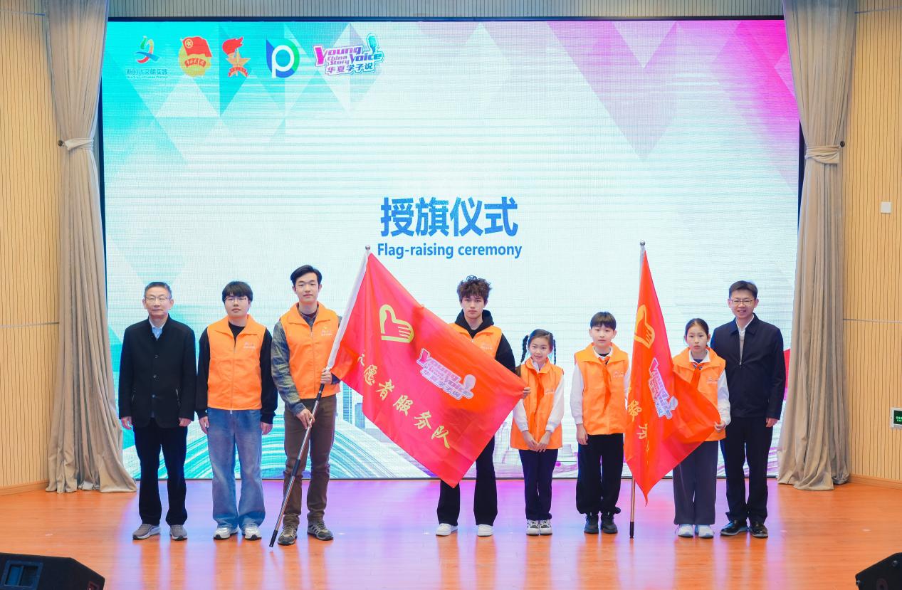 学校校长黄群、党委副书记李越现场为志愿者代表授旗,宣告“华夏学子说”志愿服务队成立。该支由高校学生与中小学生组成的服务队将在后续活动中助力青少年更好讲述中国故事。