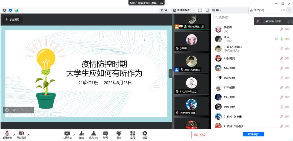 疫情当前,青年先行;共克时艰,人人有责。此次线上主题班会,使学生们进一步认识到了疫情防控形势的严峻性。拉近了特殊时期师生之间的距离,有效引导广大青年凝心聚力、共克时艰。(信机系)