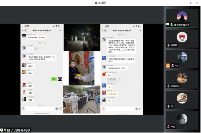 最后,信机系教学事务秘书柏婷老师分享了自己的抗疫志愿者故事。327日,柏婷老师在线完成党员社区双报到。329日,柏婷老师接到了街道党支部的电话,加入街道抗疫临时党支部,成为了一名党员抗疫志愿者。柏婷老师主要负责所在楼栋的志愿服务工作,包括:核酸检测秩序的维护、抗原、物资的发放、给有需要的人员配药、楼栋的消杀等工作。柏婷老师通过一个个小故事,号召所有老师关心楼里的孤老,关心小区的流浪小动物,团购生活必需品,减轻志愿者的负担等等。“我个人力量有限,但是我想尽自己所能,传递这份关怀和温暖,众人拾材火焰高,希望上海疫情早日得到控制,我们在校园再相聚。”